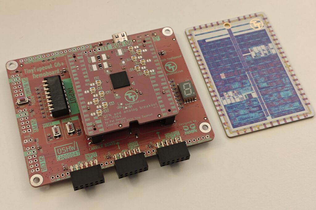 個人でも参加できるASIC開発プロジェクトの”TinyTapeout”第6回の試作で、命令セットから自作した8bit CPUをASICとして実装しました。また、デバッグ用の基板やマクロアセンブラも作り、簡単なプログラムを試作チップ上で動作させました。