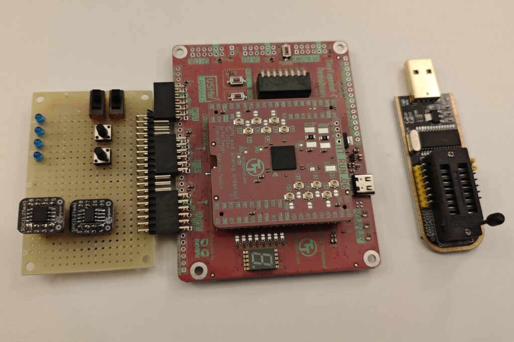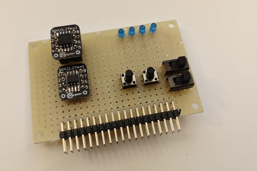 TinyTapeoutの評価ボードの下段、ベースボード側にはPMODコネクタと呼ばれるコネクタが実装されています。試作チップの信号はベースボードに実装されているRP2040に接続されるとともに、PMODコネクタにも引き出されています。今回は命令とデータ用のメモリとしてSPI Flash、SPI PSRAMを試作チップに接続しなければならないので、このPMODコネクタに刺さるような簡単なデバッグ用基板を組み立てました。2024年の9月に仕事の都合でカナダ・バンクーバーに引っ越してきたため、秋葉原にちょっと行って部品を買ってくることができず、日本からあの部品を持ってきておけばよかった…などと後悔しつつもなんとか部品を集めて基板を作ることになったのでした。この基板にはメモリの他に、実際にプログラムがきちんと動いていることを確認するためにLEDとスイッチによる簡単な入出力コンソールも実装しました。