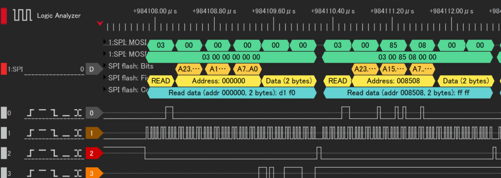 CPUが外部のSPI Flashから正しく命令を読めていないのでこういうことが起こっているのか、命令は正しく読めているのにCPU内部の処理結果がおかしいのでこうなっているのかを切り分けるため、SPI Flash用のバスにロジックアナライザーを取り付けて、SPI Flashに対して送られている信号をチェックしました。するとリセット解除直後の最初の命令読み出しは正しく0x0000番地に対して行えているのですが、次の命令読み出しでは0x8508番地と、想定と異なるアドレスへの読み出しを行っていました。最初の命令をNOPにしてもこれが起きるので、プログラムカウンタの更新が間に合っていないのではないかと考えました。そこで試作チップに与えるクロック周波数を41.67MHzから31.25MHzに落としたところ、予想が正しかったようで無事に正しく動作するようになりました。今回はリソース利用率が80.08%と高かったので、最高動作周波数があまり高くならなかったのかもしれません。
