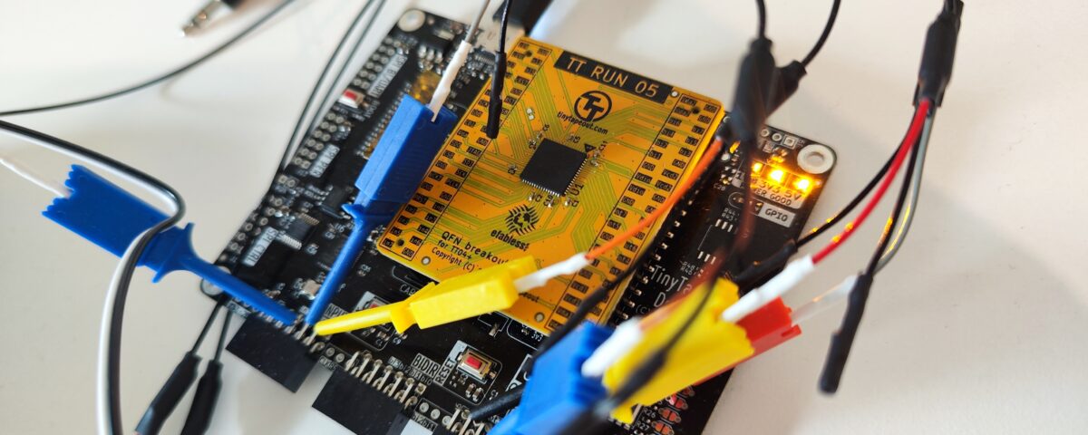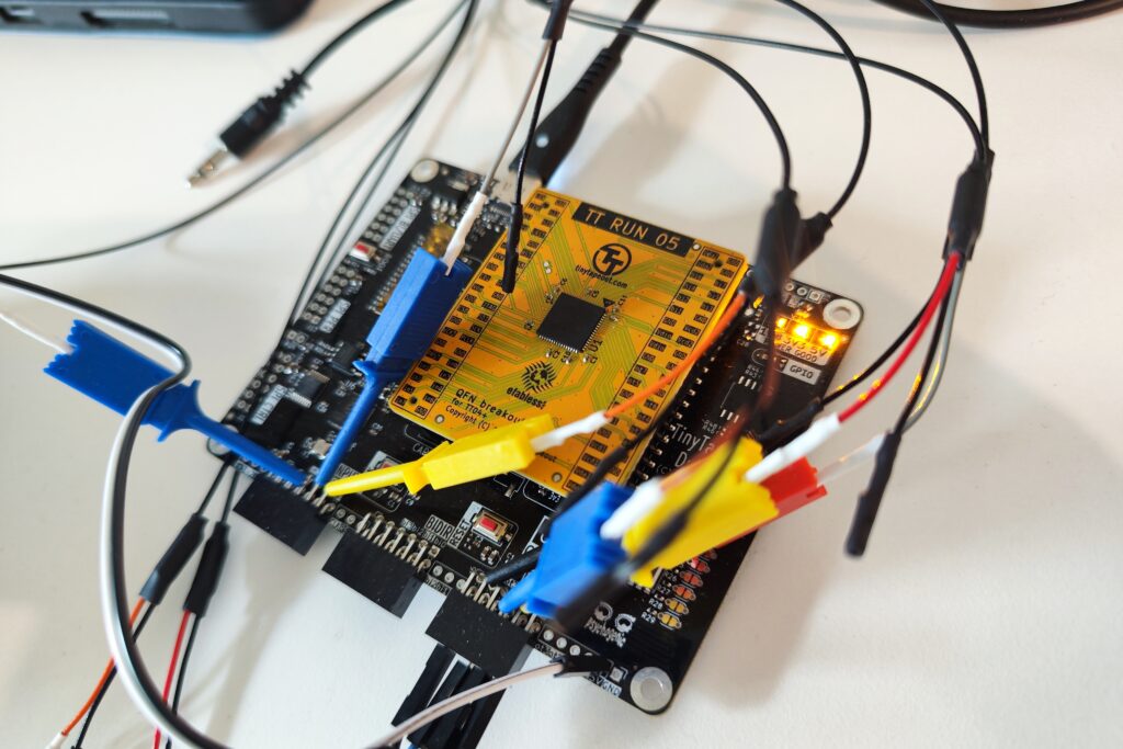 個人でも参加できるASIC開発プロジェクトである”TinyTapeout”の紹介記事「TinyTapeoutでオレオレICを作ろう」の中でも触れている、TinyTapeoutの第5回の試作に私が応募した音源ICです。黄色いボードの真ん中に載っているチップが実際に私の設計した回路が載っているASICになります。