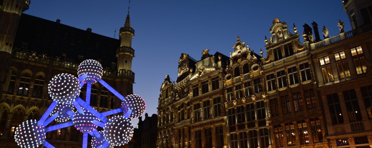 また,パリへ移動する日には夜景を撮るべく,Thalysに乗るためにブリュッセル南駅に行く前にグランプラスに写真を撮りに行きました.昼もきれいな広場でしたが,夜のライトアップも大変綺麗な広場でした.また,おそらく春節の装飾とセットで置かれていたのであろうアトミウムのミニチュアもおしゃれに光っていました.