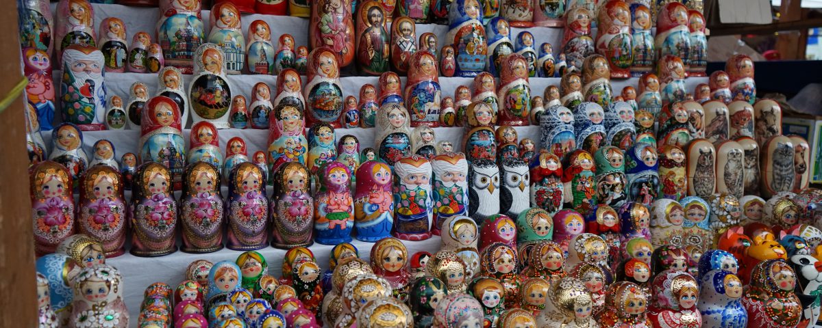 中に入るとご覧の通り、色とりどりのマトリョーシカをずらっと並べている屋台が多く目に入ります。一体一体も細かく飾りが付けられていて見ごたえがありますが、それがズラッと並ぶと壮観です。私は写真とは別のマトリョーシカ屋台でロシアの歴代指導者をモチーフにした10体セット(一番外側がプーチン大統領でその中に9体入っている)のマトリョーシカを買いました。
