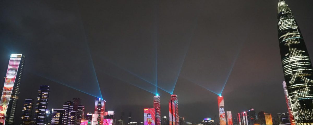 海岸城から少し歩くと人才公園に到着します。ばっちりイルミネーションの上演時間に間に合い、写真を撮ることができました。手前右側のビルは単にオフィスのライトが着いているだけのようにも見えますが、よく見ると漢字のメッセージが流れていることが分かるかと思います。