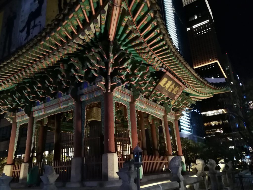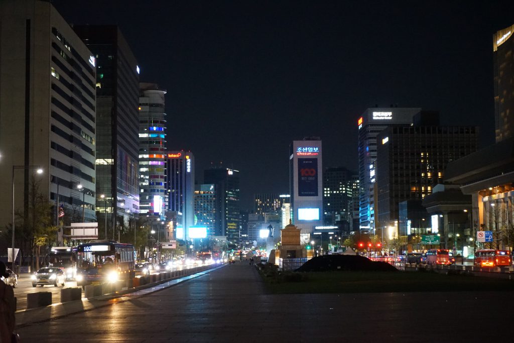 江辺テクノマートから戻ってきて今回の旅行の最後にもう一度光化門広場へ行き、光化門と世宗大王の像のライトアップを撮影しました。ついでに光化門の辺りから夜景を撮ってみました。ソウルの街並みは日本の街並みに似ていますが、道路が広く作られているせいか、東京というよりは地方の大都市といった印象を受けました。