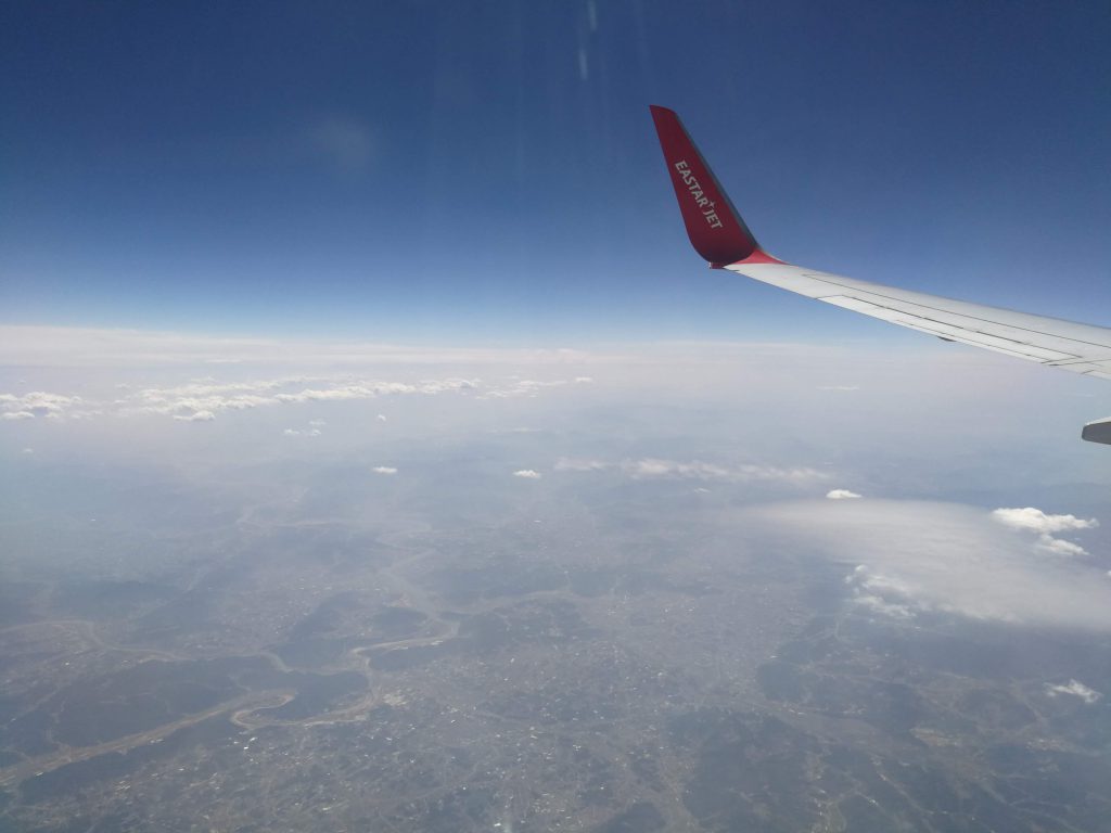 窓側の席だったので外の風景を撮ってみました。離陸して少し外を眺めて一眠りするとすぐ着陸です。乗るまでの手間は段違いですが、乗っている間の気分は国内線と大差ないですね。