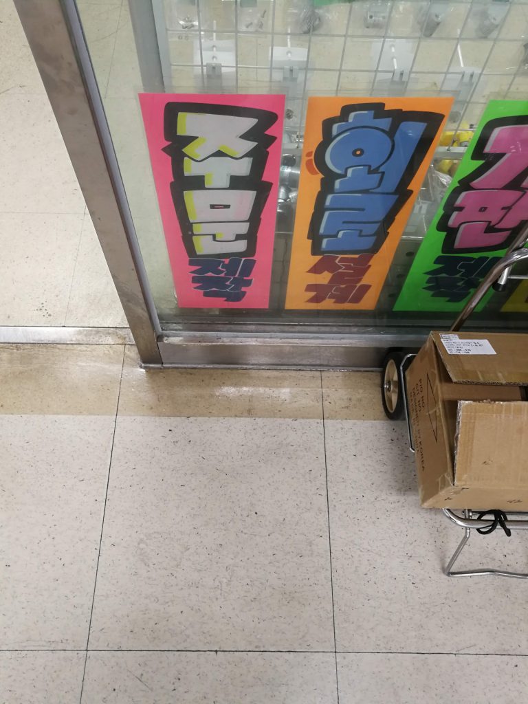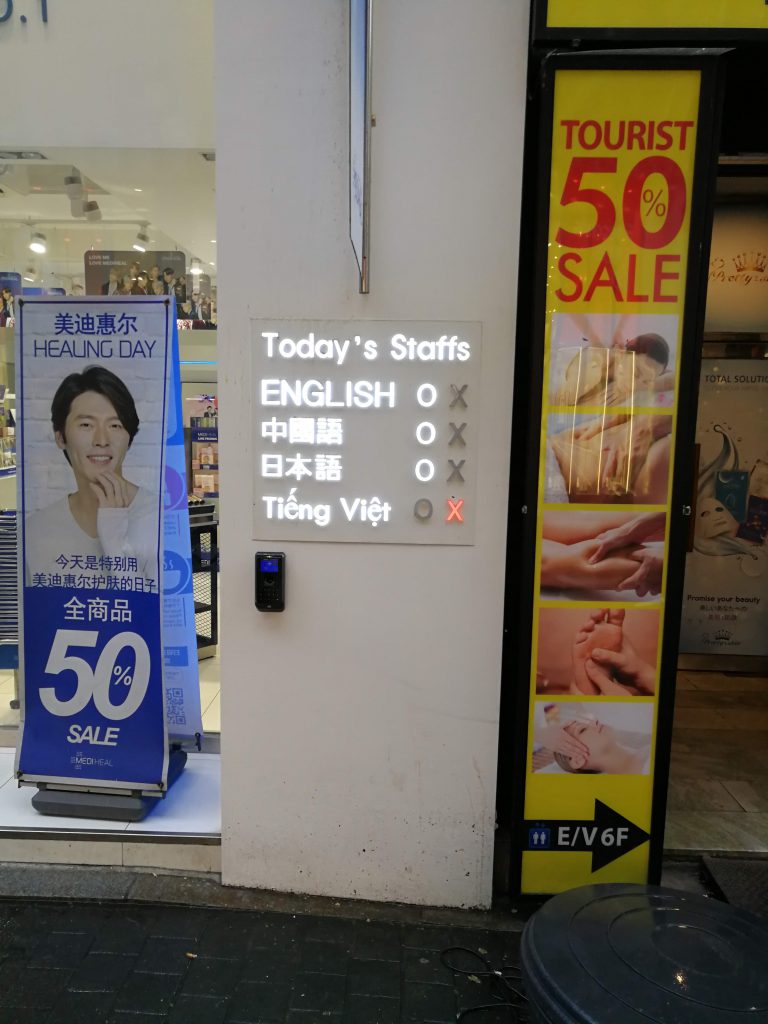 こちらはホテルのそばのお店に出ていた看板です。英語・中国語・日本語対応ができるというのが入らなくても分かるという良い工夫だと感じました。一番下を見るに、ベトナム語対応のスタッフがいるときもあるようです。韓国から見たインバウンドとしてはこの辺のエリアが主力、ということなのでしょうね。