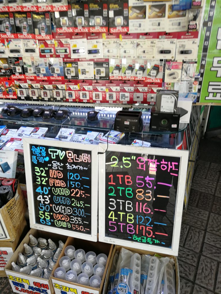 他の電気街ビルの入口にはこんな風にUSBメモリやSDカードをずらっと並べて売っているお店もありました。このあたりは本当に秋葉原に雰囲気が似ていました。