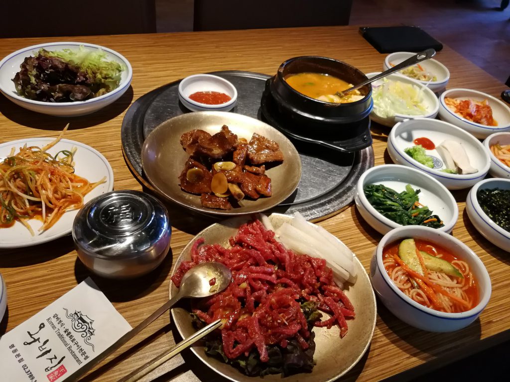 さて、龍山電子商街から戻るともう18時頃になっていました。お昼ごはんを食べるタイミングを完全に逃してしまったということもあり、早々に晩ごはんにしました。晩ごはんは明洞で一人でも入りやすいと評判の「王妃家」へ行きました。メインの豚カルビが来る前からこの通りずらっと小皿が並んでいました。