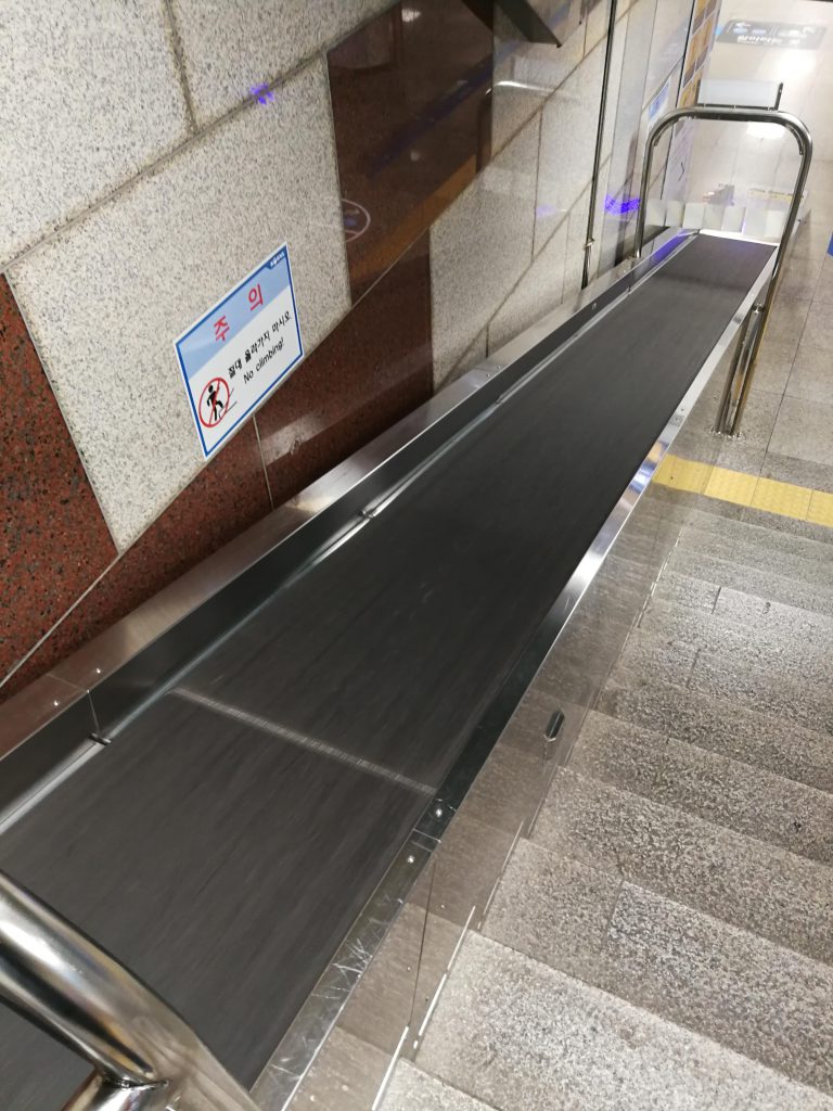 チェックアウト後はバックパックをソウル駅のコインロッカーに預け、荷物を軽くしてから街歩きに出発しました。ソウル駅の階段には荷物の運搬用なのか、このようなベルトコンベアが設置されていました。