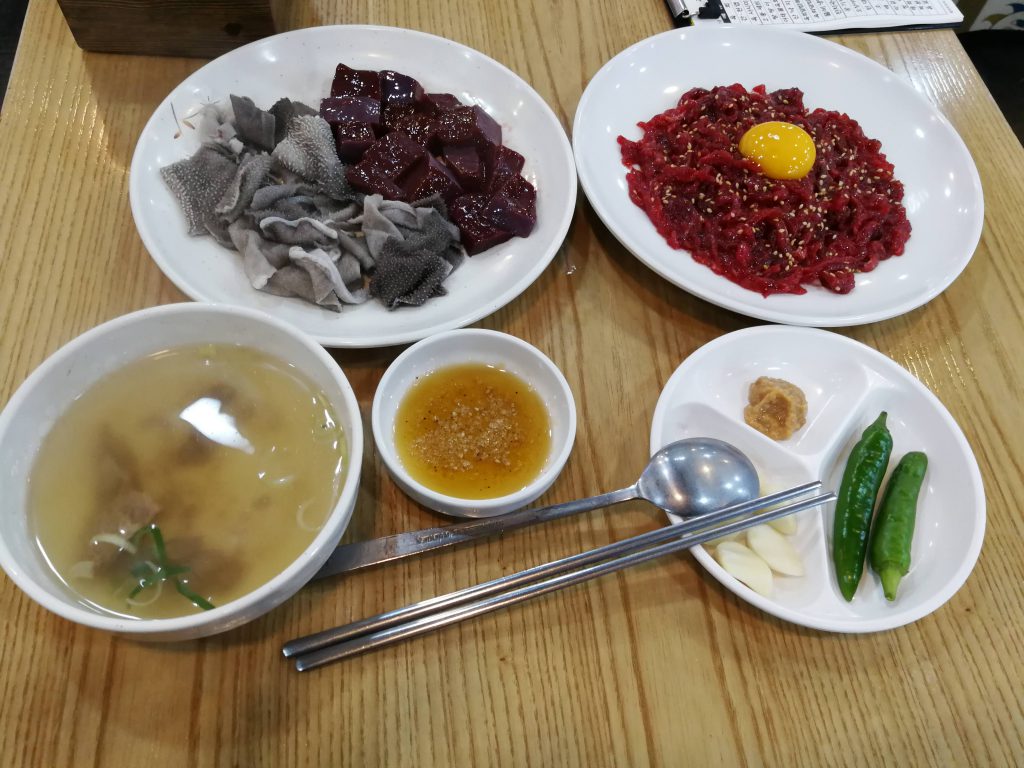 チヂミが美味しかったことに味を占めて、市場の中のレストランに入って日本ではアウトなもののオンパレードのような昼食を食べました。そう、センマイ刺しにレバ刺し、そしてユッケです。センマイ刺しとレバ刺しは写真中央の塩を混ぜたごま油につけて食べました。
