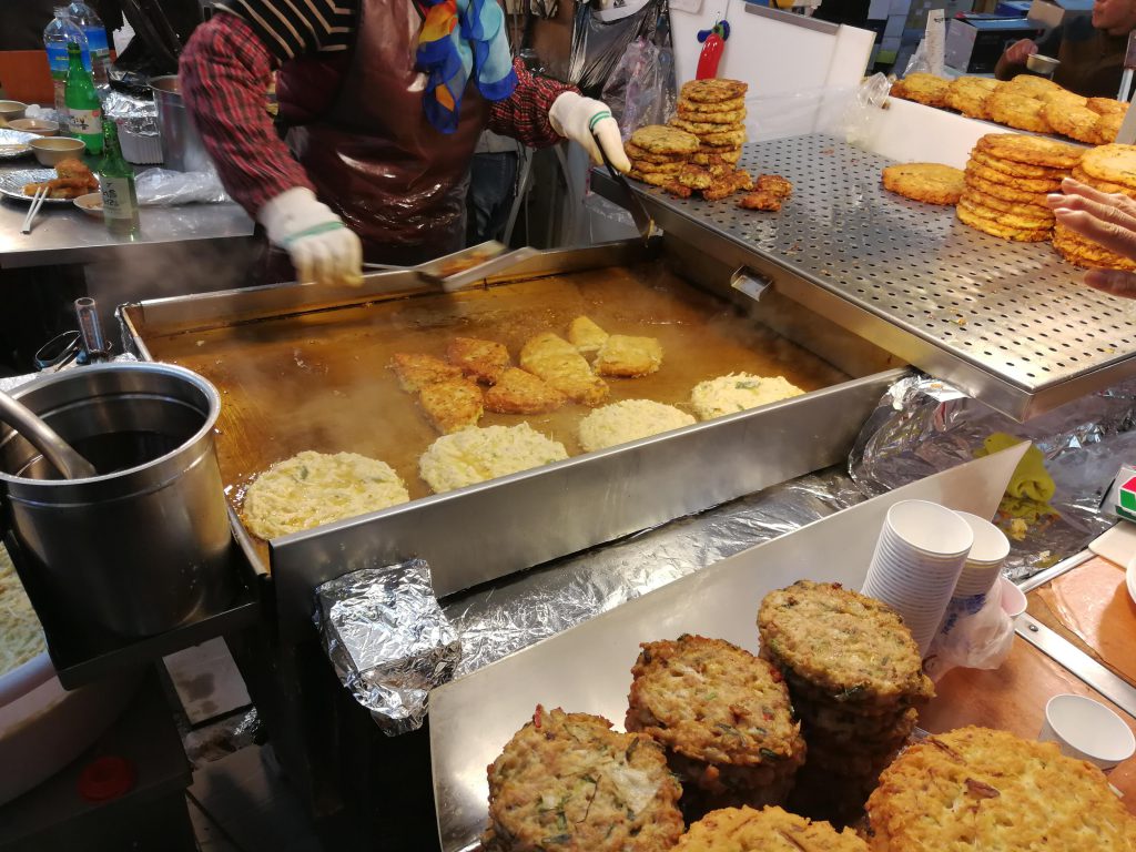 時刻はまだ12時を回っていませんでしたが、せっかくだからとまずはチヂミをオーダーしました。目の前で揚げてくれます。1
