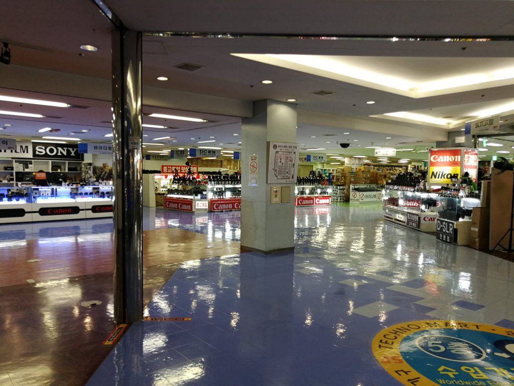 南大門市場をぶらついた後は、ソウル駅から地下鉄を乗り継いで1時間弱のところにある「江辺テクノマート」へ行きました。龍山電子商街と違いここはソウルに来るまでは全く存在を知らなかったお店です。ホテルをチェックアウトする際に、フロントのスタッフさんにものは試しと電気街っぽいものはないかと聞いたところ、ここを教えてもらったのでした。行くのに1時間近くかかるとは思っていませんでしたが、ここはなかなかのヒットでした。ご覧の通り、かなり広いフロアにカメラ専門店やPC専門店など、デジタル製品を売る店がテナントとして多数入居しているスタイルの電気街ビルでした。