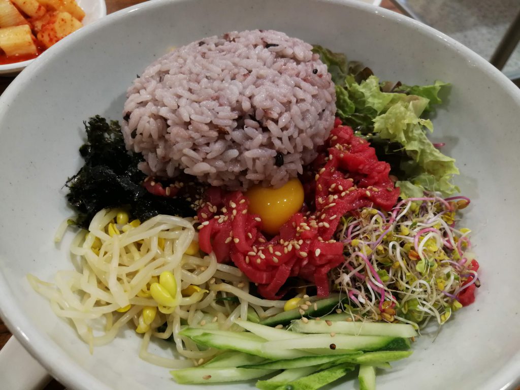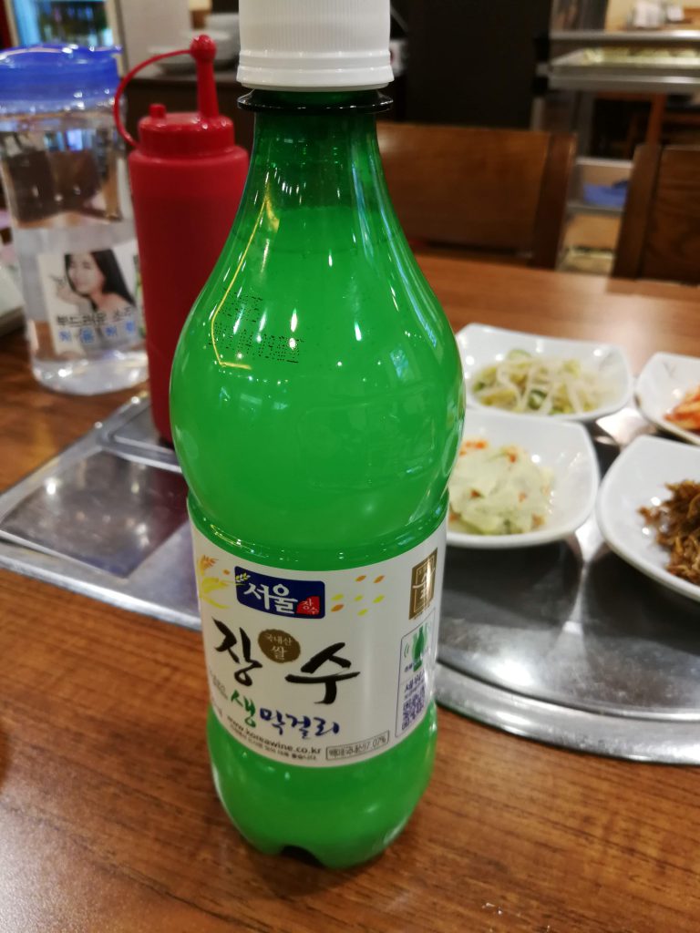 そんなこんなでブラブラしていたらご飯時になってしまったので上層階のレストランフロアで晩ごはんにユッケビビンバを食べました。ここまで来ても懲りずにユッケであります。写真を撮る前にご飯を入れられてしまったので、ちょっと雑な見た目になってしまいました。(おいしかったのでいいのですが!)そしてせっかくなのでマッコリもオーダーしました。流石に一人で一本開けるのはまあまあ度数が高いことと炭酸入りなこともありちょっと大変でした。量としては大したことないと思うのですが、一人飯をしている最中だとペースが早くなってしまうのですよね。