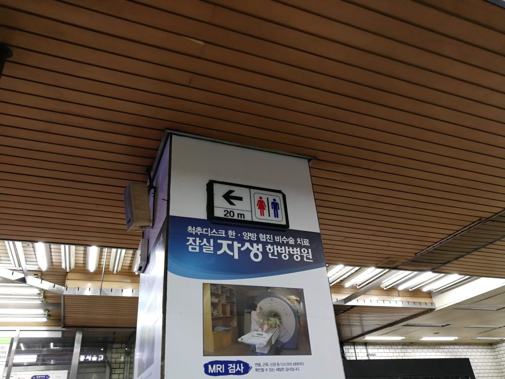 こちらは地下鉄の江辺駅の写真ですが、ここに限らずソウル市内はトイレまでの案内が非常に丁寧な印象を受けました。ソウルオリンピックの時に観光客対応も兼ねてこの手の看板を整備した、とかなのでしょうか?