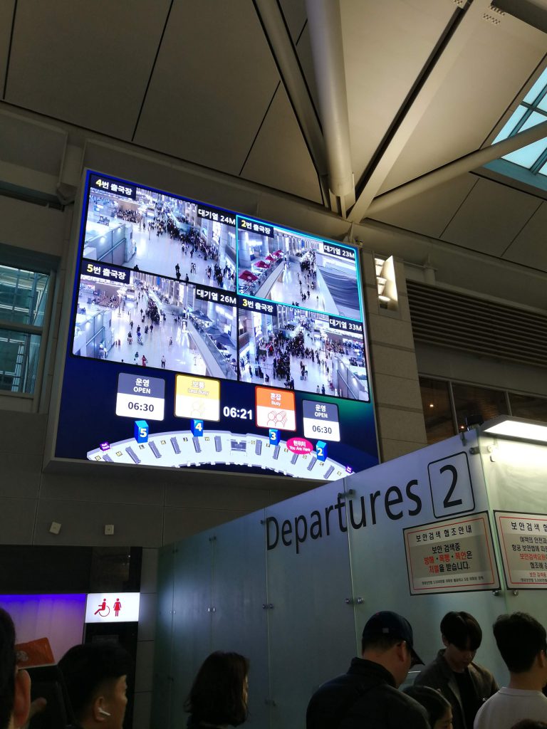 さて、3日目は朝8時発のフライトに乗るべく、5時起きで空港へと戻りました。空港へはエアポートホテルの送迎サービスですんなり向かうことが出来ました。朝ということでまだ検査場があまり開いていなかったのですが、各検査場の混雑状況を示すモニタがあったのが印象的でした。2