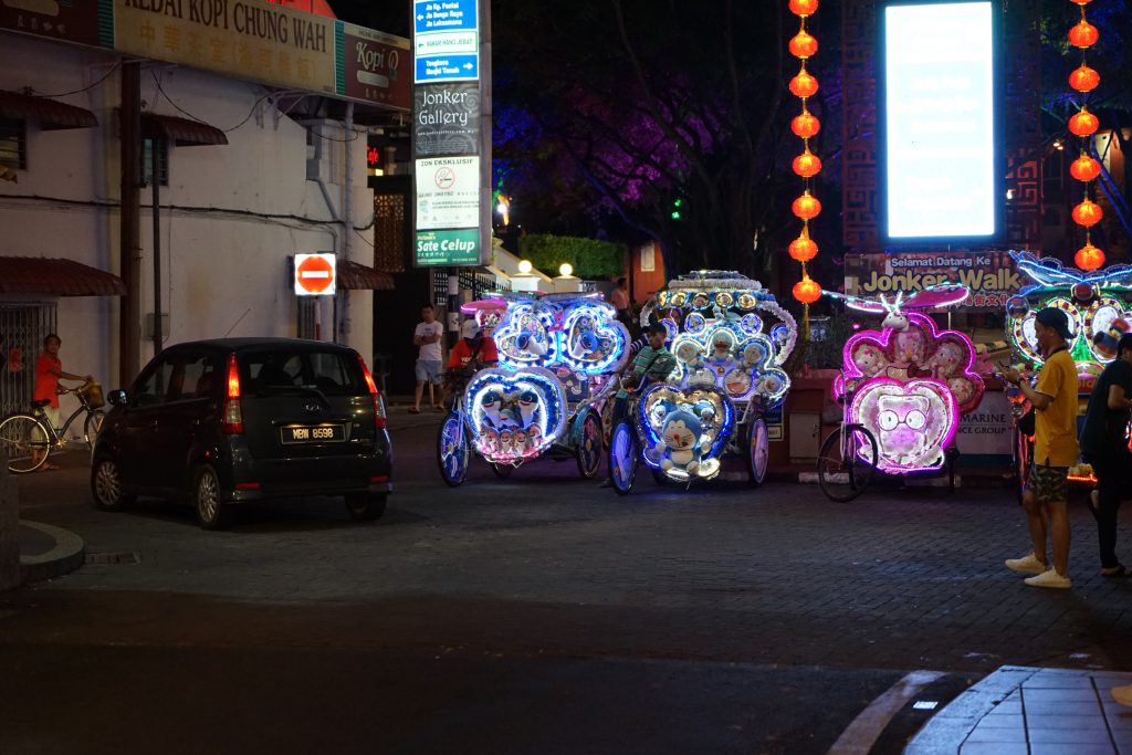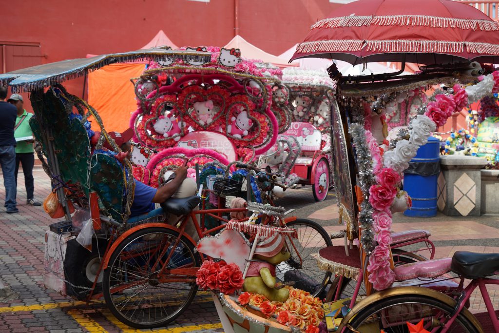 オランダ広場の一枚目の写真にも写っていますが、トライショーもまたマラッカの名物です。自転車の横にお客を乗せるサイドカーがついたような構成の車両で、どの車両もご覧のようにゴテゴテにデコレーションされています。自転車をベースにした車両なので言うまでもなく推進力は人力なのですが、なぜか一部電化されていて爆音で日本語の歌謡曲を流しながら走るトライショーも度々見かけました。2枚目の写真のトライショーも後部に大きなスピーカーを積んでいますね。