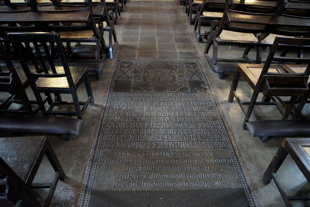 床に埋め込まれたプレートがまた歴史を物語っています。下の方の文章は古いオランダ語なのでしょうか?