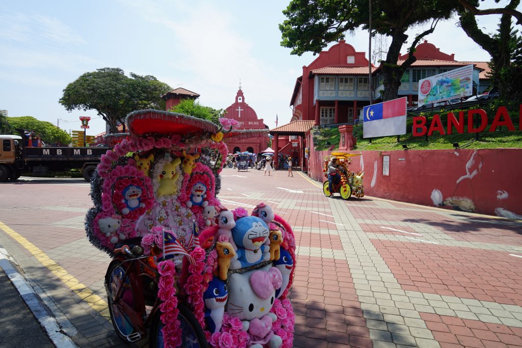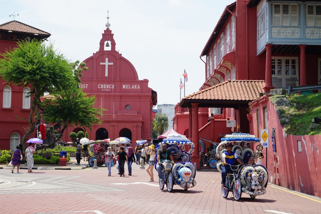 橋を渡ると「マラッカといえばここ!」という感じの光景が広がります。だいたいのマラッカの観光ガイドではオランダ広場か、中央奥に見えるマラッカキリスト教会のアップの写真が大々的にフィーチャーされているのではないかと思います。