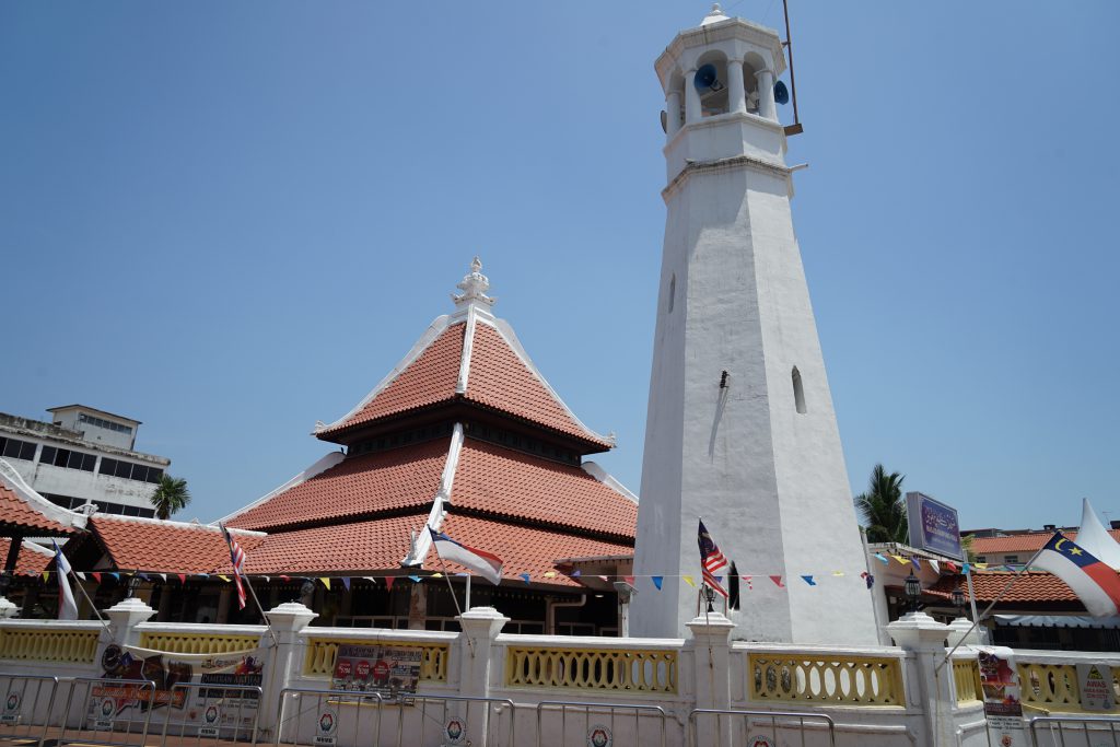 その後更に歩いてマレーシア最古のモスクであるカンポン・フル・モスクへと行きました。ちょうどたどり着いた頃は礼拝の時間で、アザーン5が流れていました。ちなみに2014年にクアラルンプールを訪問した時に初めて知ったのですが、玉ねぎ型のドーム構造ではなく、写真のように三角の屋根を持っているのがマレーシアの伝統的なモスクだそうです。