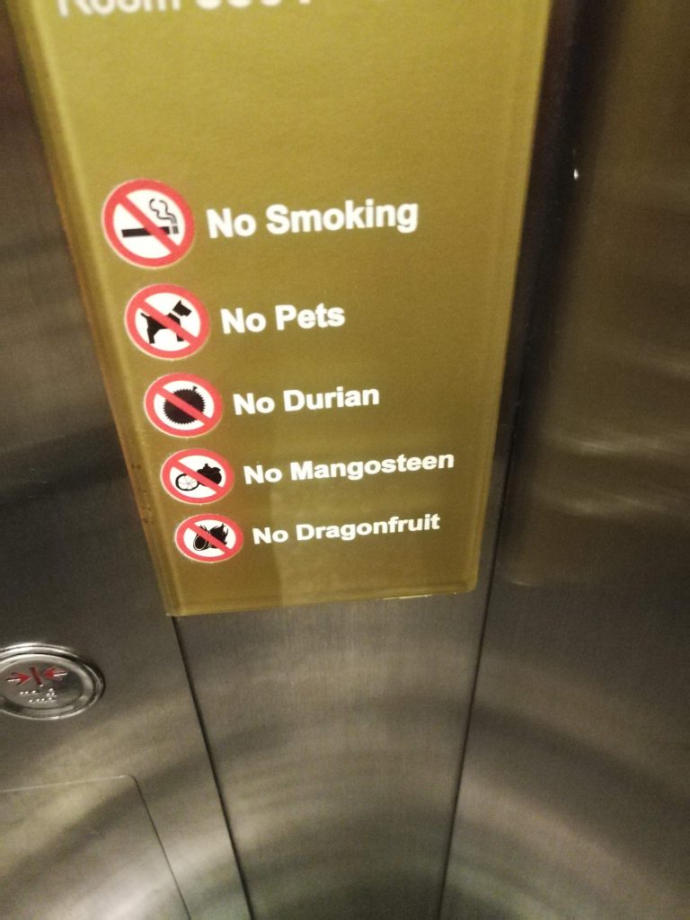 翌朝はまず起きてホテル1階の朝食会場へと向かいました。上の写真はホテルのエレベーターにあった注意書きです。タバコ、ペット、ドリアン禁止まではいいとして、マンゴスチンとドラゴンフルーツはなぜ…と不思議に思ったのですが、マンゴスチンとドラゴンフルーツの赤色が布に付くと洗っても取れないから、という理由だそうです2。