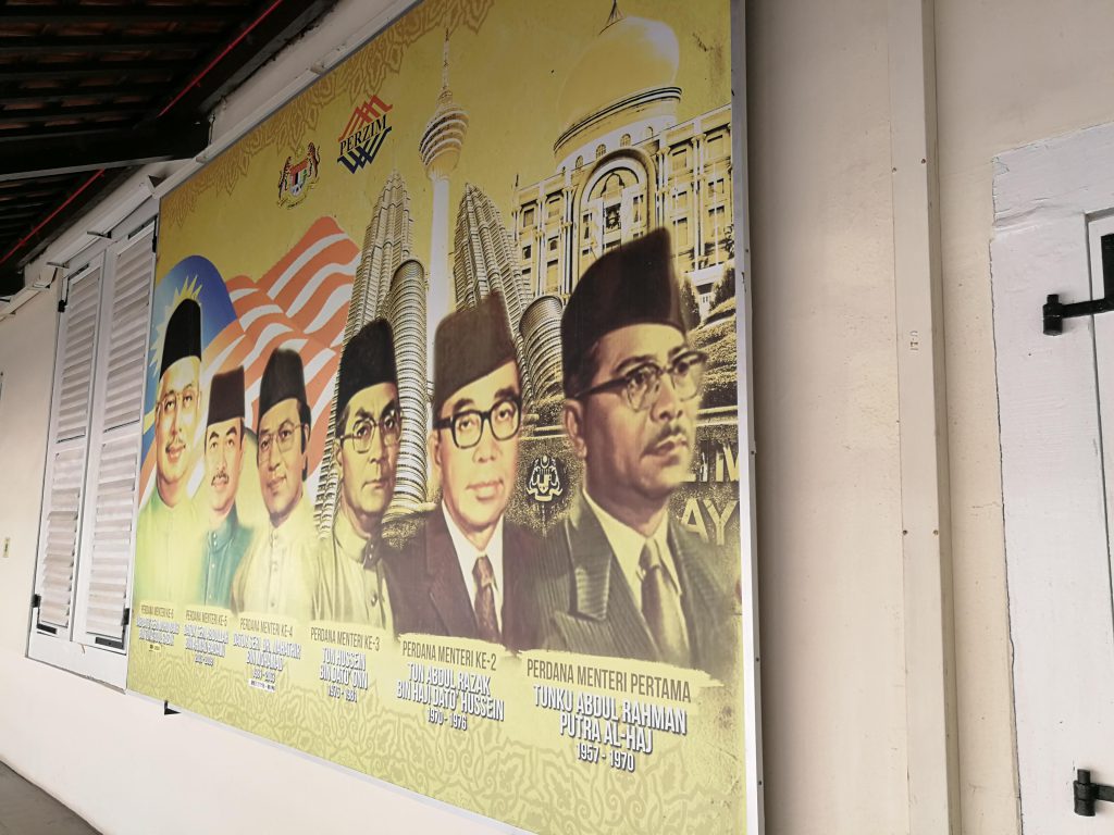 こちらは博物館の外廊下に飾ってあった看板です。歴史的展示品というわけではないのですが、ちょっとおもしろかったので紹介します。見て分かる人は分かるかと思いますが、こちらの看板に描かれているのはマレーシアの歴代首相です。