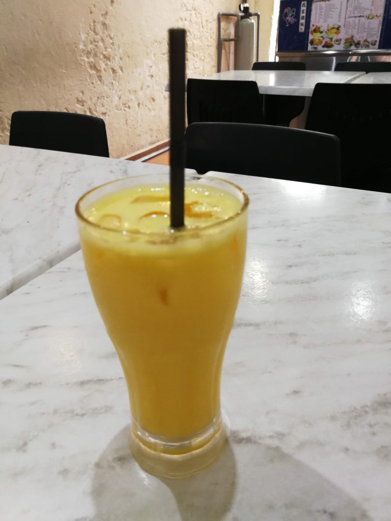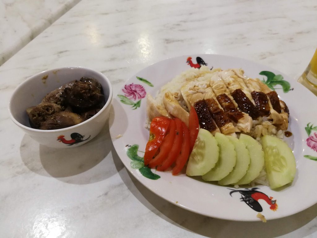 アッサムラクサはいまひとつ自分の口には合わなかったので、改めてチキンライスも食べてしまいました。飲み物はマンゴースムージーで、おまけに鶏レバーまで付けてしまいました。