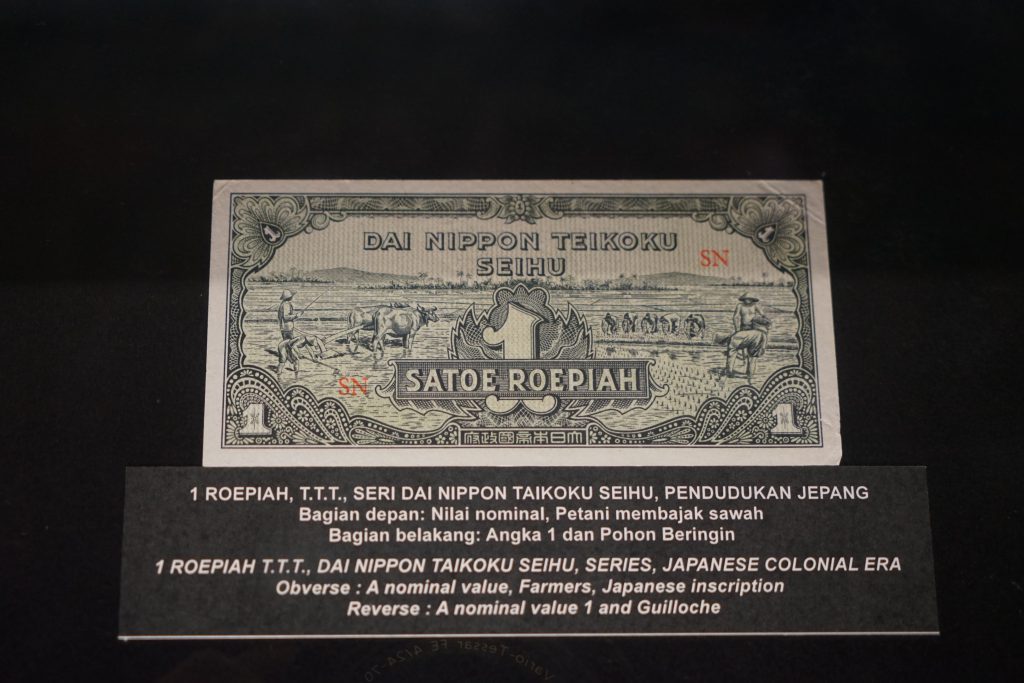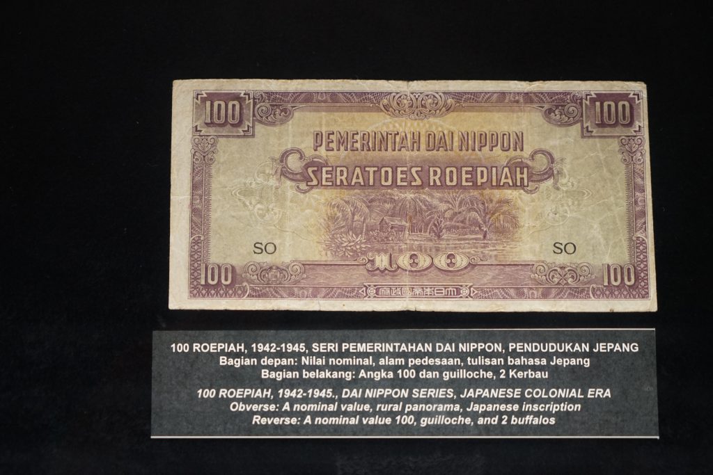 こちらは大日本帝国政府発行の100ルピアと1ルピア紙幣(軍票)です。マラッカのスタダイスで見た紙幣はドル紙幣でしたが、インドネシアのエリアでは単位はルピアで発行していたんですね。調べてみると元々の現地通貨と単位を合わせていたということでした。マラッカは日本に占領される前はイギリス領だったのでポンドじゃないのかな?と思ったのですが、当時のマラッカを含むイギリス領のマレー半島一帯は海峡植民地として統治されていて、流通していた通貨は海峡ドルだったということなので、それに合わせて「ドル」で発行されていたということなんでしょうね。