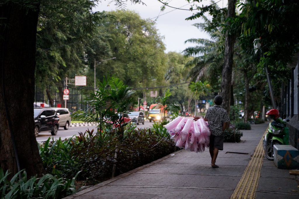 ジャカルタ大聖堂とイスティクラル・モスクは道を挟んで並んでいるのですが、道を渡る際に綿あめ売りのおじさんを見かけて写真を撮りました。東南アジアな雰囲気満点の1枚が撮れたと思っています。