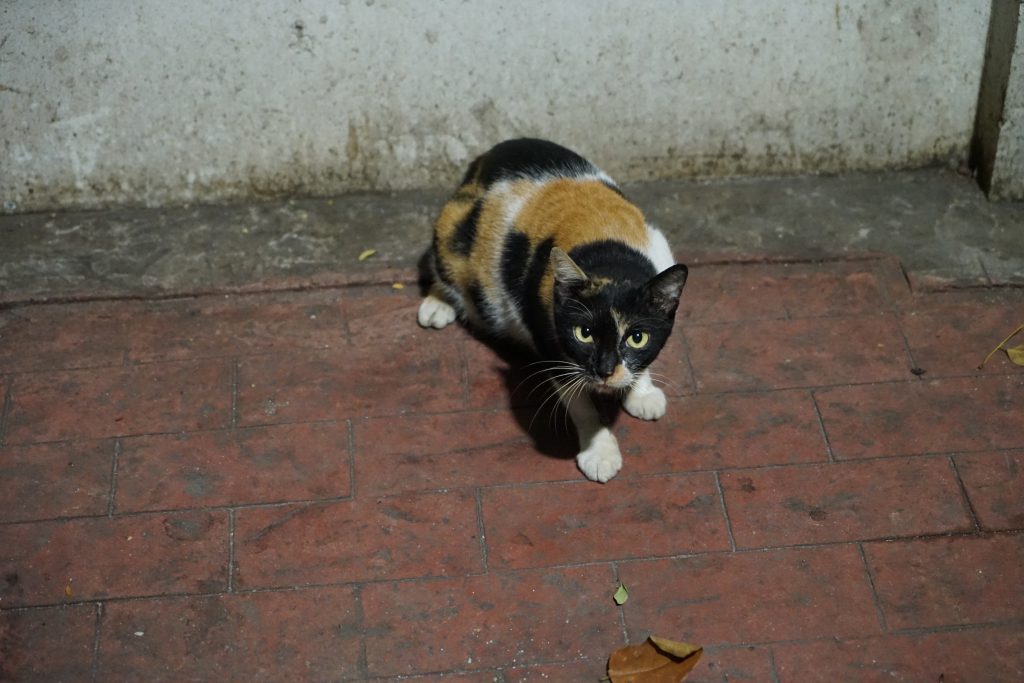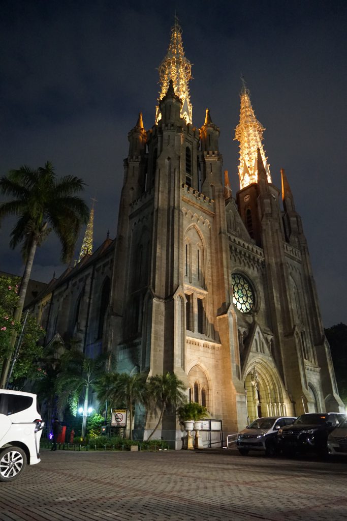 イスティクラル・モスクを出ると外も大分暗くなっていて、ジャカルタ大聖堂のライトアップが始まっていました。2枚目の写真は大聖堂の近くにいた三毛猫です。ジャカルタは猫がいっぱいです。昼は暑いので寝て過ごして夜に活動するのでしょうか?