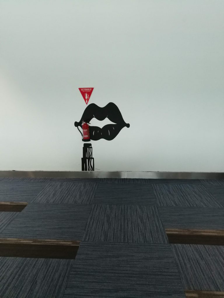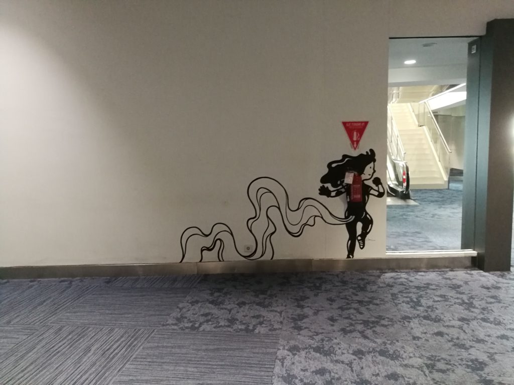 空港を出るまでの間にいくつか見かけたのがこちらの消火器置き場です。壁の絵とあわせてコミカルに消火器置き場を演出しています。普段から消火器がどこにあるか意識するようになるでしょうし、いい工夫かもしれませんね。