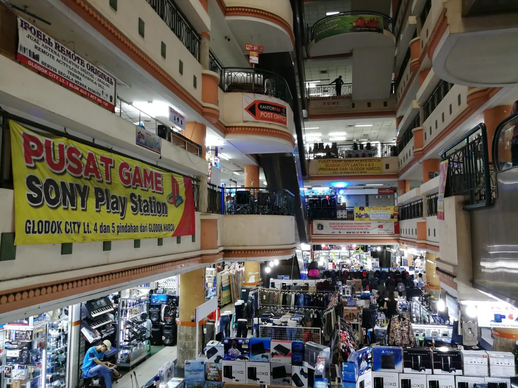 Glodok市場中央部の吹き抜けから写真を撮ってみました。見てすぐ気がつくかと思いますが、やたらとPS3推しでした。上層階の方に行くと完成品(?)のPS3ではなく、分解されて基板が取り出されているPS3を多数並べているお店も見かけました。ニコイチ修理や部品付け替えによる修理をした再生品も流通しているようです。訪問当時は言うまでもなくPS4がリリースされてから結構経っていますが、今でもPS3が主力なように見えるのはインドネシアの経済事情からすると新品のPS4は高い…ということなのだろうなと思ったのでした。”PUSAT GAME”という横断幕がありますが、これは翻訳すると「ゲームセンター」という意味のようです。ベトナムでも見かけたことがありますが、家庭用ゲーム機を時間貸しするようなゲームセンターがあるということなんでしょうかね。