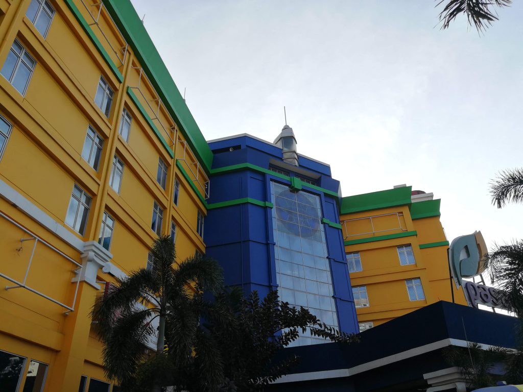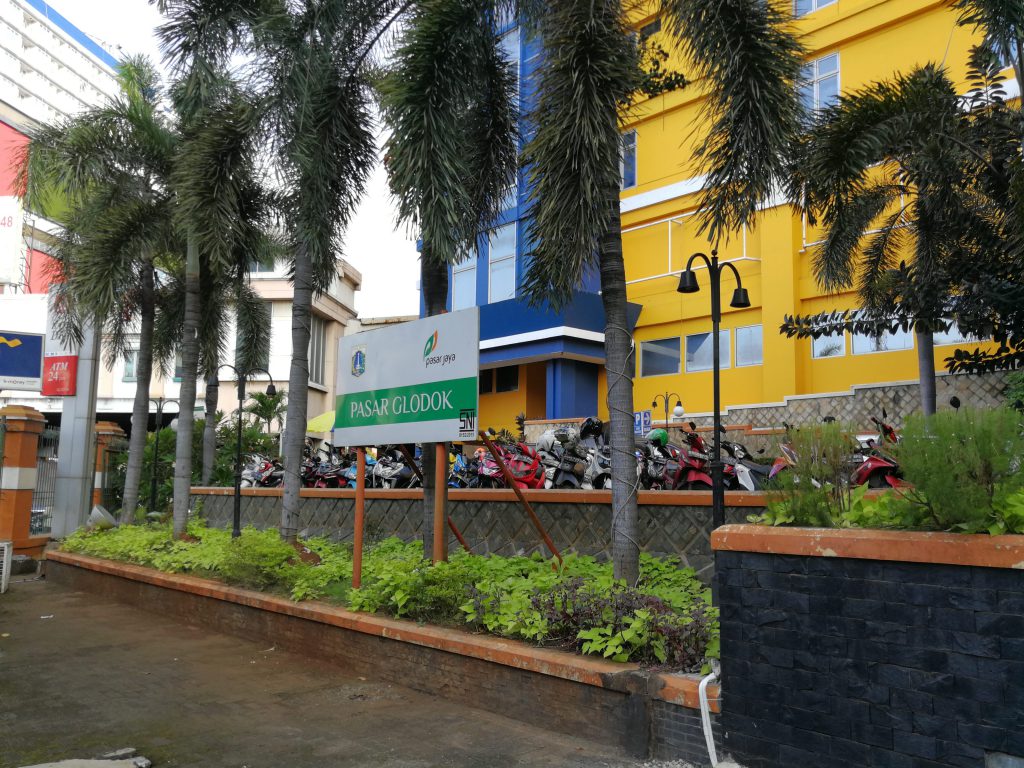 今回向かったのはジャカルタの電気街ビルとして有名なGlodok市場です。Glodokはこのあたりの地名、Pasarは「市場」の意味です。上の写真の黄色のビルがメインですが、通りを挟んだ向かい側の別のテナントビルにも2階部分の連絡通路で接続されていて、そちらにも電気街らしいお店が入居しています。