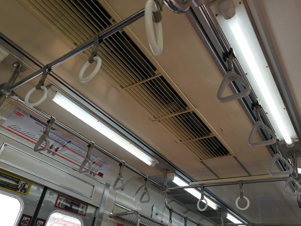 内部もご覧の通り、扉のシールの雰囲気はさておき、昔の山手線・京浜東北線という雰囲気です。この車両よりも後に製造された姉妹車にはなりますが、いまでも武蔵野線などでは205系電車を見かけるので、懐かしいような妙な日常感があるような不思議な感じです。