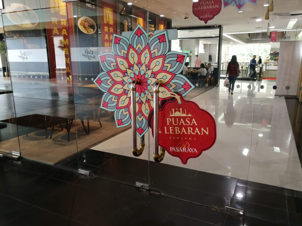 ちなみに先ほども書きましたがこの日はラマダン入りの日だったため、入口のドアや店内にはそれに関連した装飾がされていました。”PUASA”は「断食」、”LEBARAN”はラマダン明けの休暇を指す単語です。
