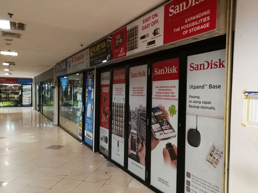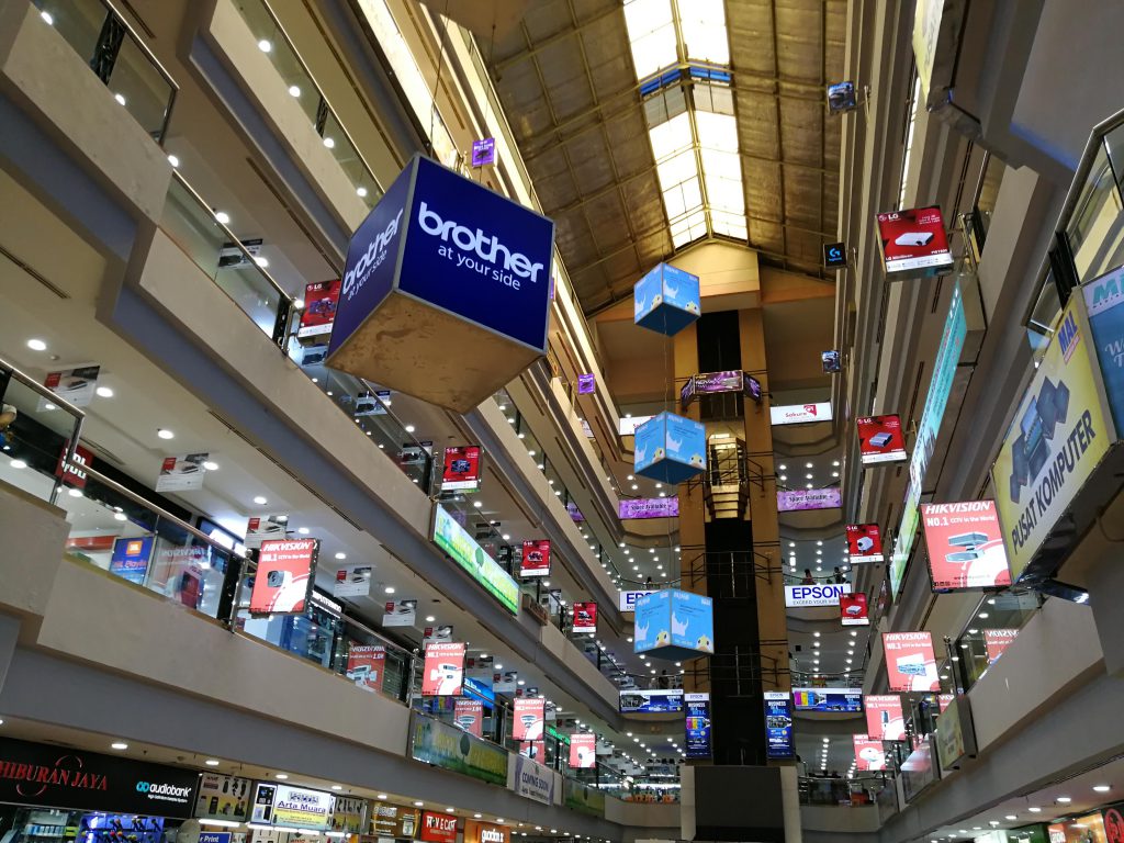 さて、そんなわけでITCマンガドゥアにはお土産物店を期待して来たのですが、意外にも連絡通路を通って別のエリアへ移動すると様相が変わり、ご覧の通りデジタル製品の様々なブランドの看板が並んだ電気街のようなエリアが広がっていました。Glodok市場と違い、こちらはPC・OA関連製品を扱う店が多い印象でした。