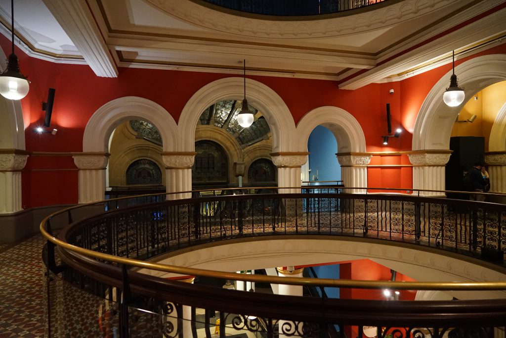 中に入ってすぐの円形通路は赤色の壁がアクセントですが、落ち着いた雰囲気の絨毯や手すりなどと合わさってシックにまとまっています。上を見上げると吸い込まれそうな吹き抜けとガラスのドームが見えます。