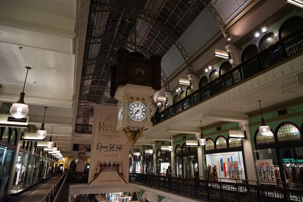 こちらはもう一つの大時計、グレート・オーストラリアン・クロックです。同じく機械仕掛けの時計で、こちらはオーストラリアの歴史を表現するジオラマが毎正時に動作するそうです。時計もさることながら、ショッピングモールなのに通路を撮るだけでここまで映えるというのが驚きです。写真を撮りながら、2018年に訪問したモスクワの赤の広場に面しているグム百貨店も夜はこんな雰囲気だったのだろうか…と思ったりしました。