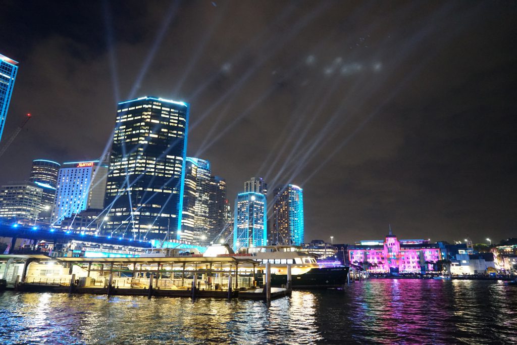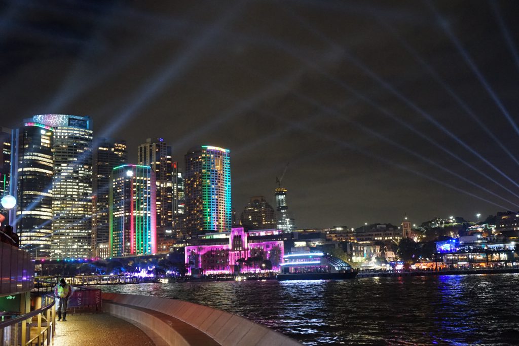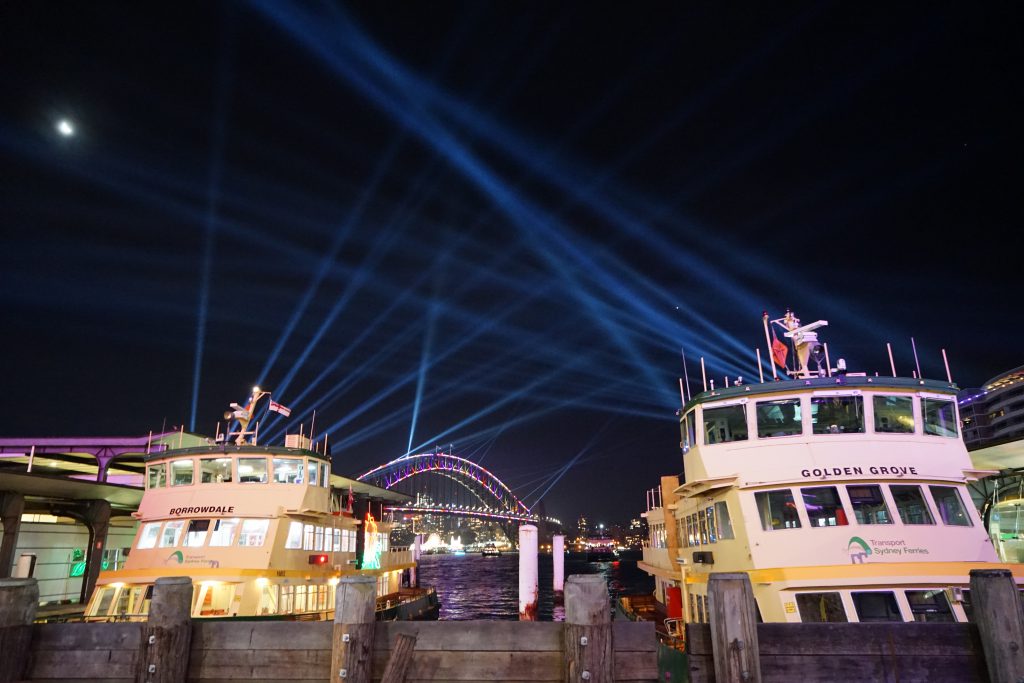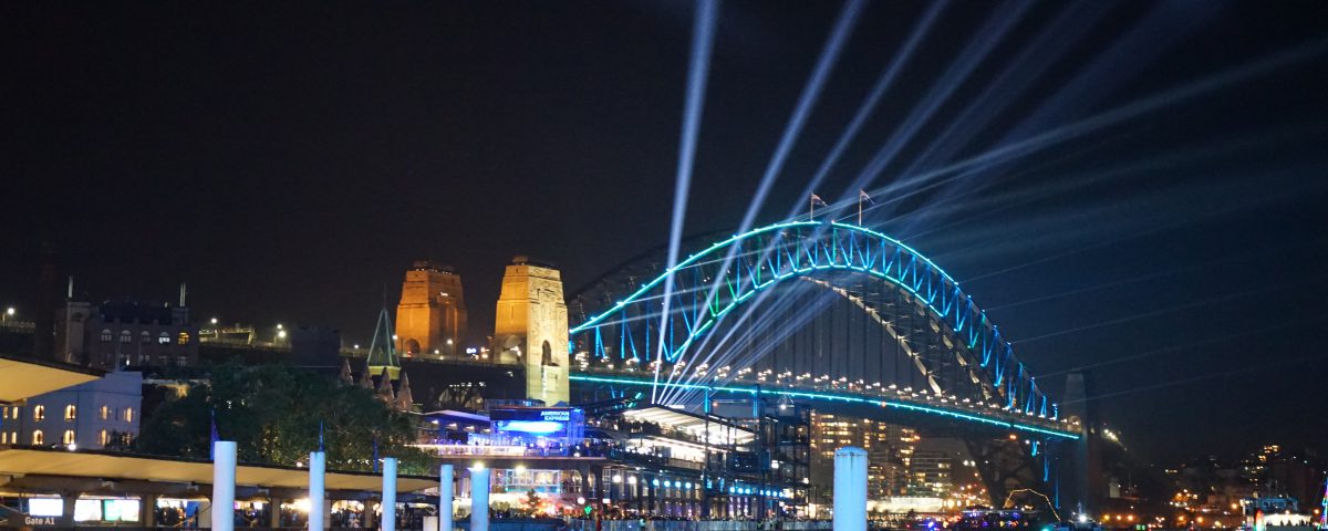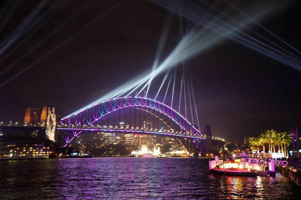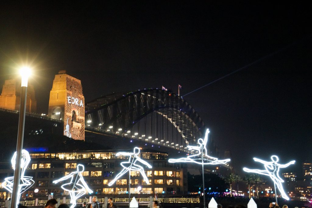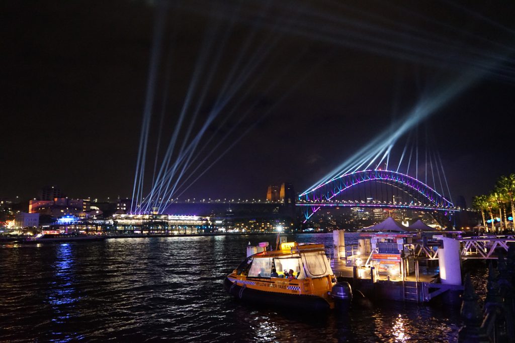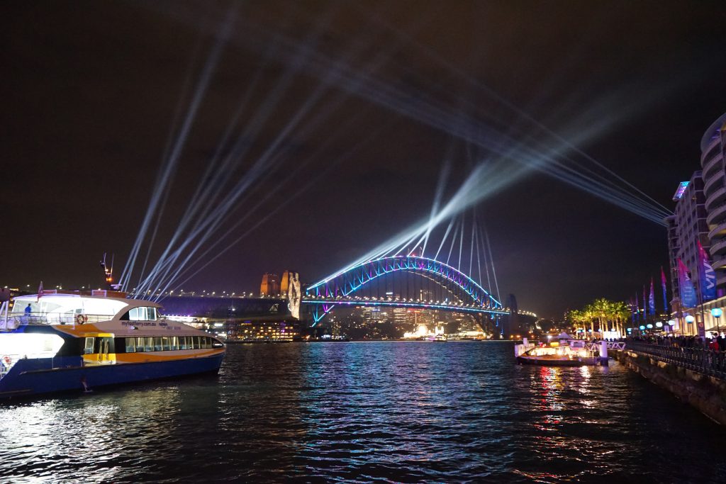 ご覧の通り、Vivid Sydneyはサーキュラー・キーのあたりを中心に開催され、それはもう容赦ないサーチライトとLEDによるライトアップがされています。シドニーの海岸のシンボルの一つであるハーバー・ブリッジもこの通り、バリバリのライトアップで色がカラフルに変化していました。