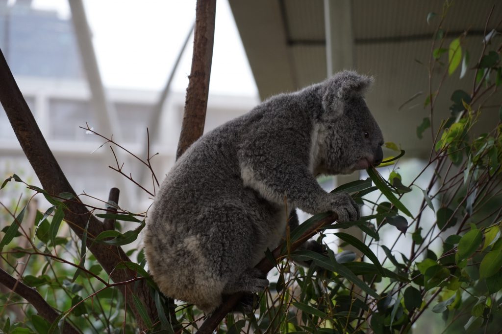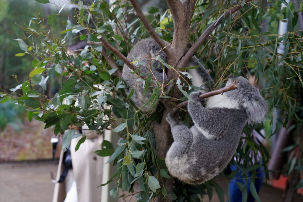 そして同じく定番中の定番、コアラです。コアラが登っている木のあるエリアを歩き回る体験も有料でできるのですが、そこまでせずともご覧の通りかなり間近からコアラを見ることができます。しかし衝撃的だったのが隣の木に移るために一旦地面に降りたコアラの動きです。「あ゛~よっこらせ」というような、おじさん感満点の動きだったのでした。