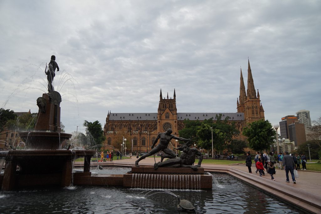 ハイド・パークの横切るように歩いていくと見えてくるのがこちら、シドニー・セント・メアリー大聖堂です。手前の噴水は噴水でアーチボルドの噴水という名前がついています。