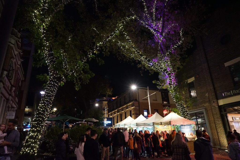 この日はハーバー・ブリッジの柱のそばまで歩いていきました。1枚目でプロジェクションマッピングされているのはシドニー現代美術館です。このあたりは屋台コーナーもあり、ライトアップショーというだけでなくちょっとしたお祭りのような雰囲気になっていました。