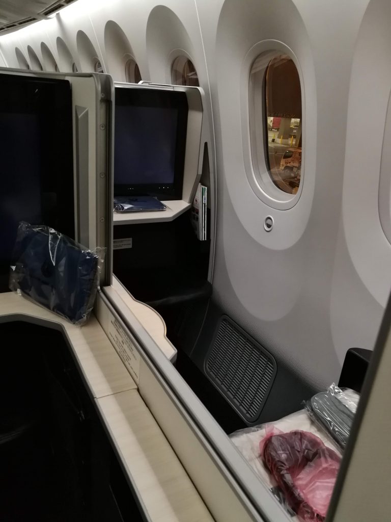 さて、元々はプレミアムエコノミークラスで予約していたのですが、出張直後ということで行きはこれまでのJGC修行でためたマイルを奮発してビジネスクラスにアップグレードしたのでした。3月の広州往復でビジネスクラスには乗っていますが、長距離路線のビジネスクラスはこれが初めてです。