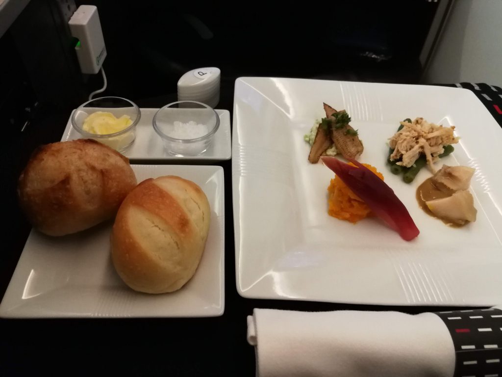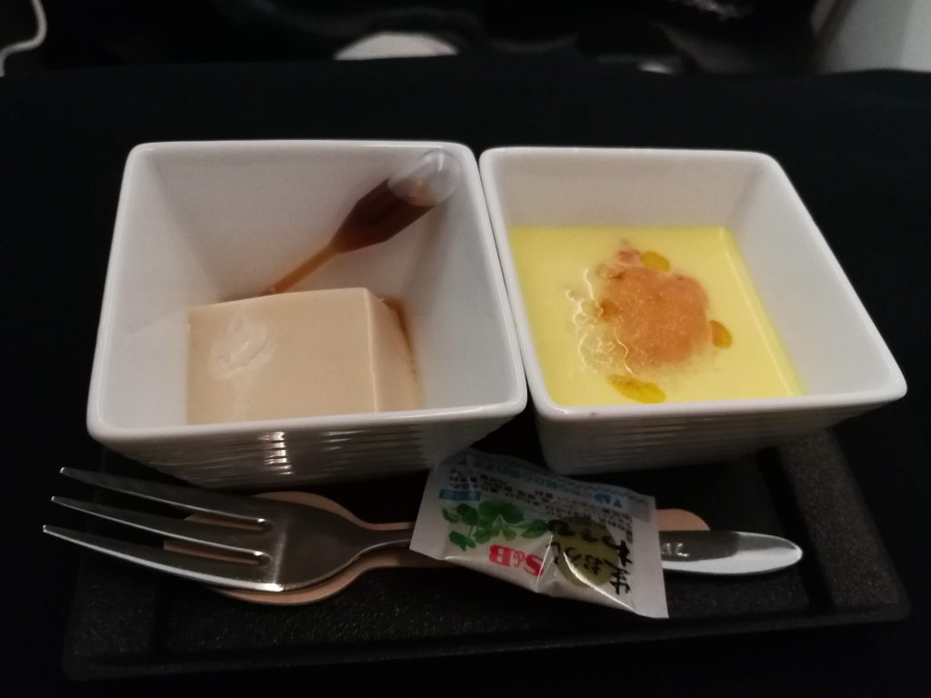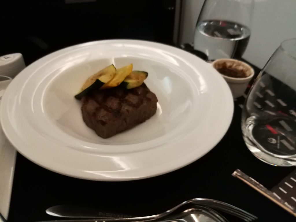離陸してからしばらくすると今度は機内食です。広州便はお昼ごはんでしたが、こちらは晩ごはんということで、コースになっていました。メインはステーキですが、前菜でアワビが出てくるとはビジネスクラス恐るべしです。