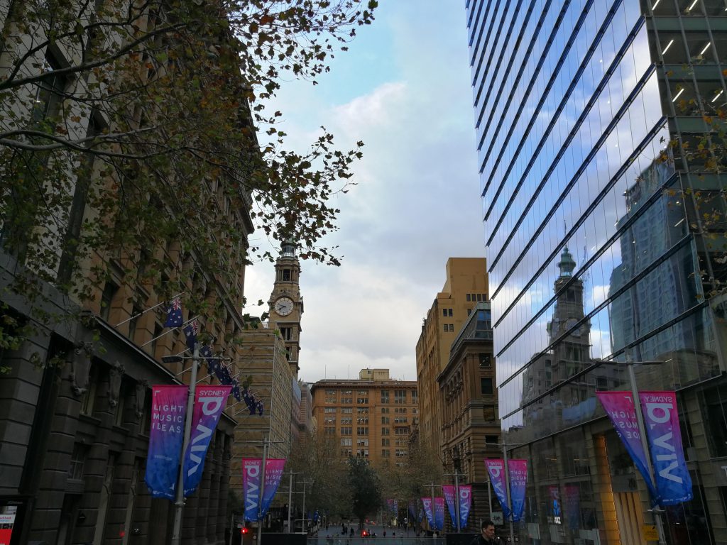 前日も訪問したセント・ジェームズ教会のあたりからシドニー中心部の大きな公園であるハイド・パークに入っていき、さらに歩いていきました。1枚目に写っているのぼりはVivid Sydneyののぼりです。