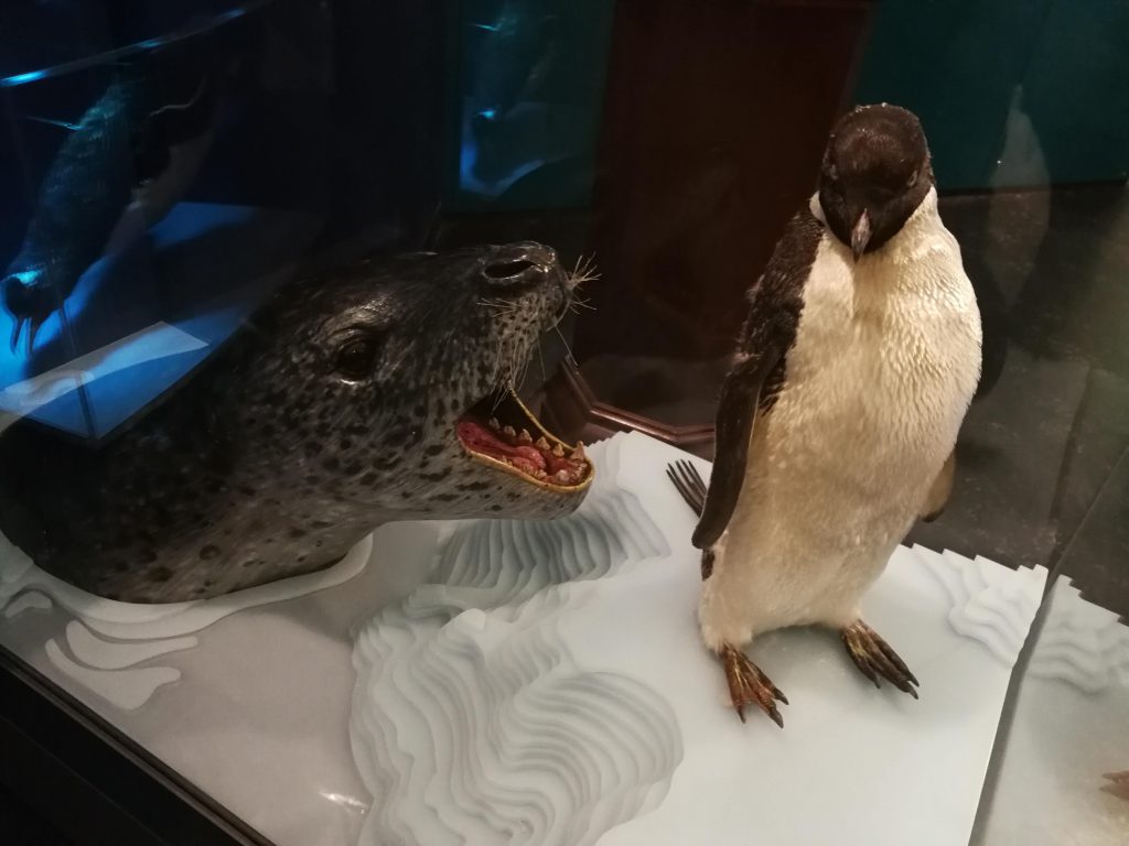 これまたワイルドな展示であります。アザラシの顔もなかなかですが、ペンギンの目つきもすごい…