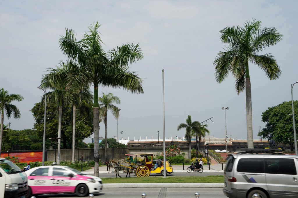 上に書いたとおり早朝の到着だったので、時間を問わず開いている施設ということでまずはリサール公園へ行きました。1枚目の写真はリサール公園の通りを挟んだ向かい側のキロメートル・ゼロ(基準点)の広場を写した写真です。ここにも馬車がいました。