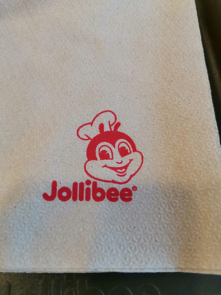 ジョリビーの定番ということで、今回はこのフライドチキンとパスタのセットを注文しました。オーダーを受け取る際の紙ナプキンにもリトル・ジョリビーの顔がプリントされています。