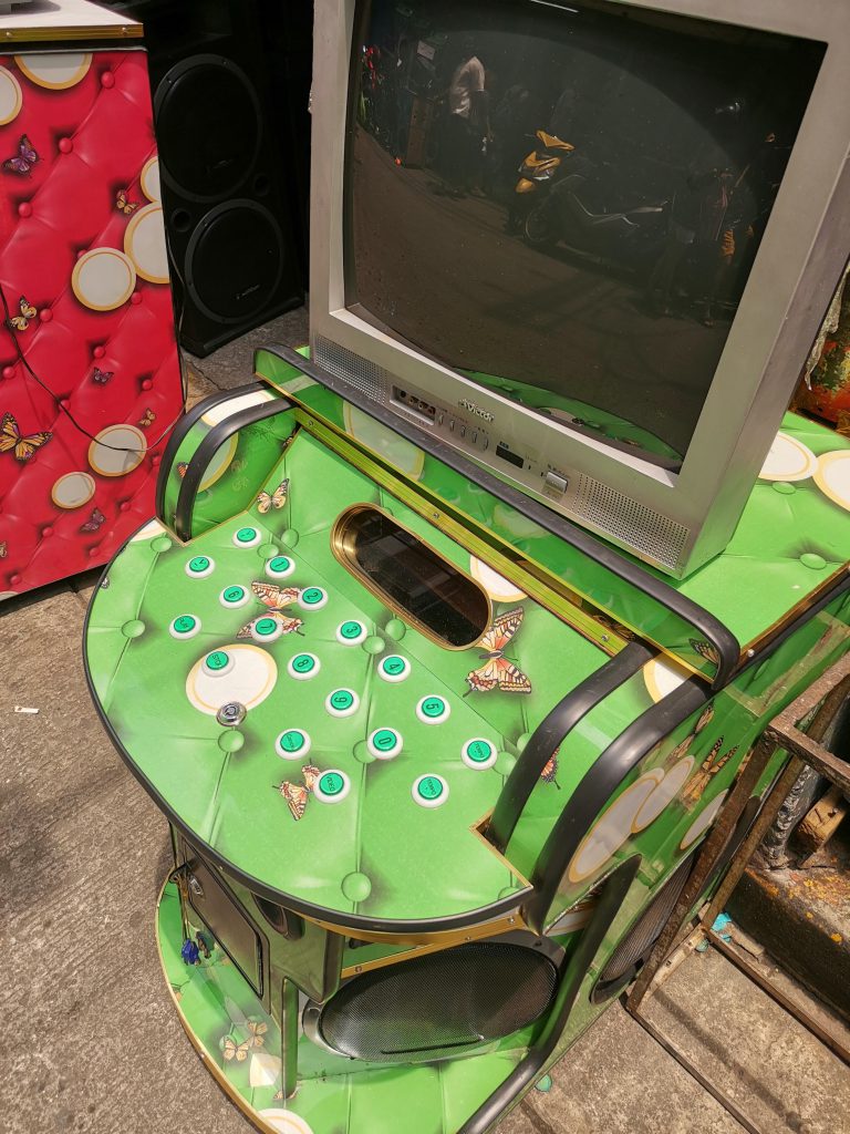 個人的に一番おもしろかったのはこちらの写真に写っているの謎のテレビ台(?)です。通りを歩いていて最初に見かけた時は上にテレビが乗っておらず、謎のカラーリングのスピーカーだなあ、なんだろう…と思ったのですが、テレビが乗った姿を見てこれはおそらくカラオケセットだと気が付きました。台の上部のボタンは多分曲番号を入れるためのボタンですね。これは他の国の電気街では見たことがなく、なかなか新鮮でした。写真にも見切れているように1台だけ置いてあったのではなく、複数台並んでいましたし何か所かで見かけたのでそれなりに需要があるのだと思います。そして久々にブラウン管のテレビを見ました。日本のテレビが中古で輸出されたもののようでしたが、一体何年選手なんでしょうか…?