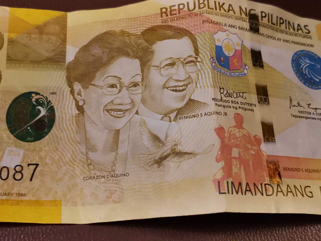さて、少し余談ですが、マニラの空港である「ニノイ・アキノ」国際空港の名前はかつてフィリピンの上院議員であったベニグノ・アキノ・ジュニア氏の愛称から取られています。彼は独裁政権であったフェルディナンド・マルコス政権を批判し、脅かす存在として国外追放されてしまいます。1983年にニノイ・アキノ氏はフィリピンへ戻るのですが、現在のニノイ・アキノ国際空港で飛行機から降りた直後、暗殺されてしまうのでした。これをきっかけにマルコス政権に反対する勢力が伸長し、最終的に1986年にマルコス氏は退陣することになり、後任としてニノイ・アキノ氏の意志を継いだ妻のコラソン・アキノ氏が大統領となったのでした。今でもニノイ・アキノ氏とコラソン・アキノ氏の肖像画は500ペソ紙幣に描かれています。