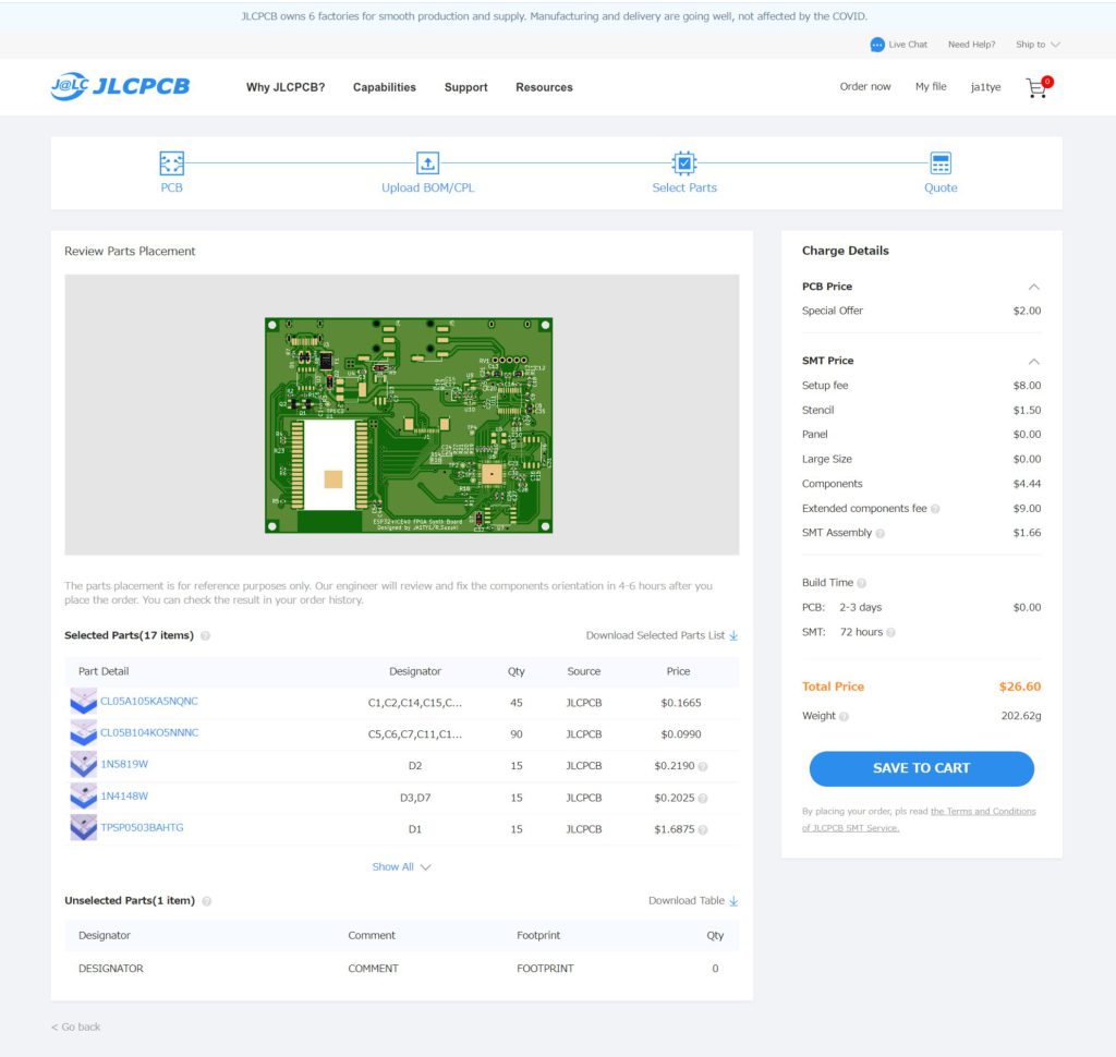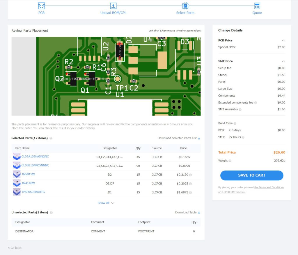 実装する部品の種類、個数、実装の向きについて特に問題がなくなったら、価格を確認して”SAVE TO CART”を押します。今回はIC類は手持ちを使う予定なので小物部品のみ実装依頼をしていることもあって、部品代は基板5枚分で4.44ドルでした。